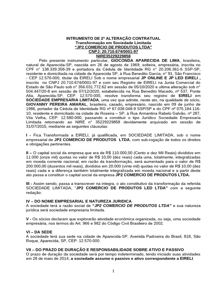 A sociedade terá a razão social de “JP2 COMERCIO DE PRODUTOS LTDA” e sua natureza