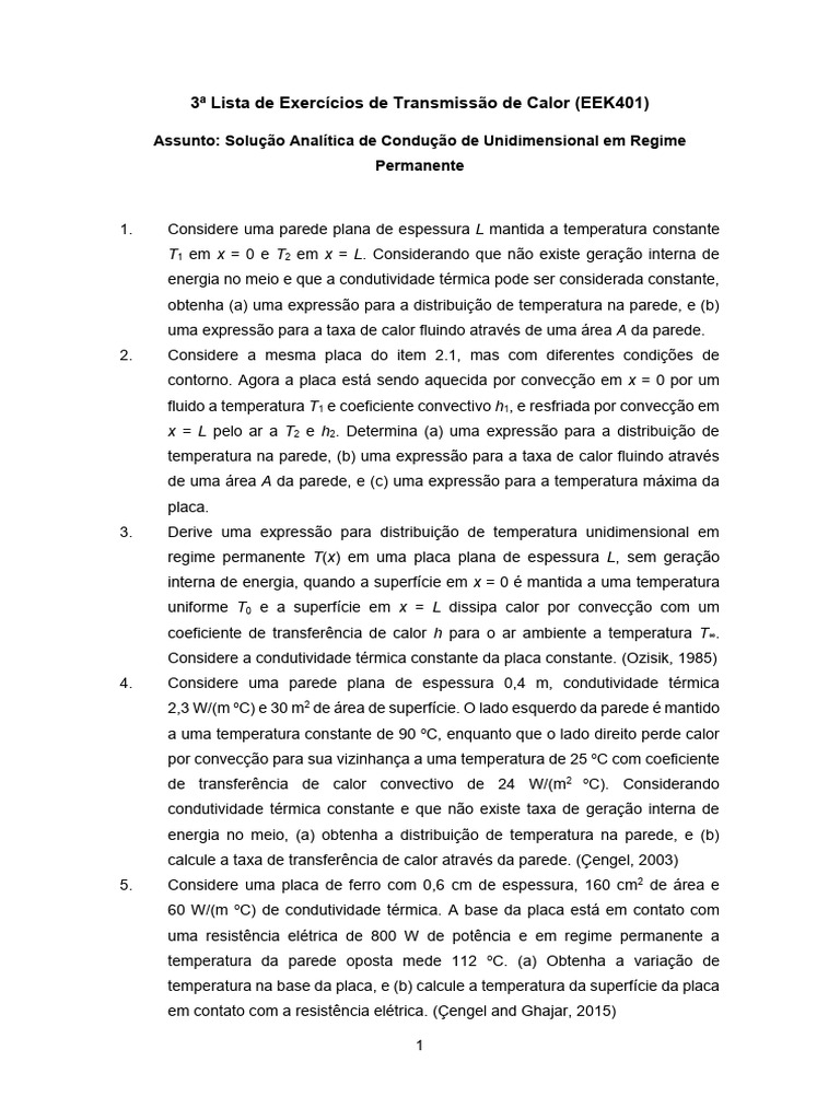 1. Considere uma parede plana de espessura L mantida a temperatura constante