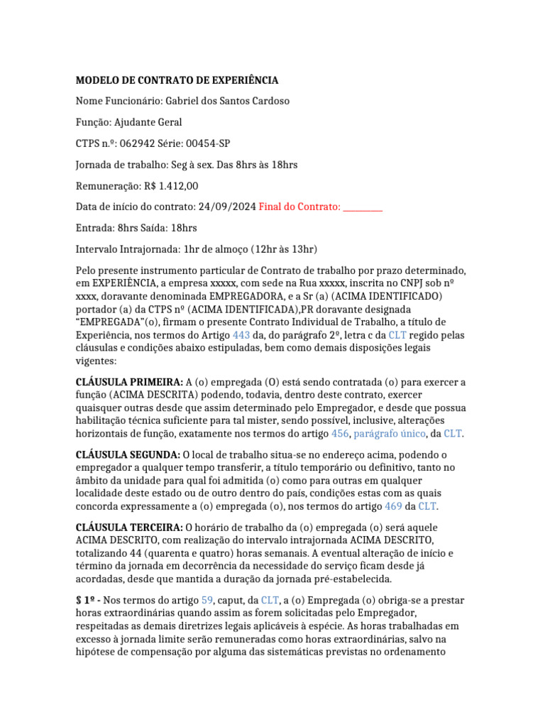 Data de início do contrato: 24/09/2024 Final do Contrato: __________