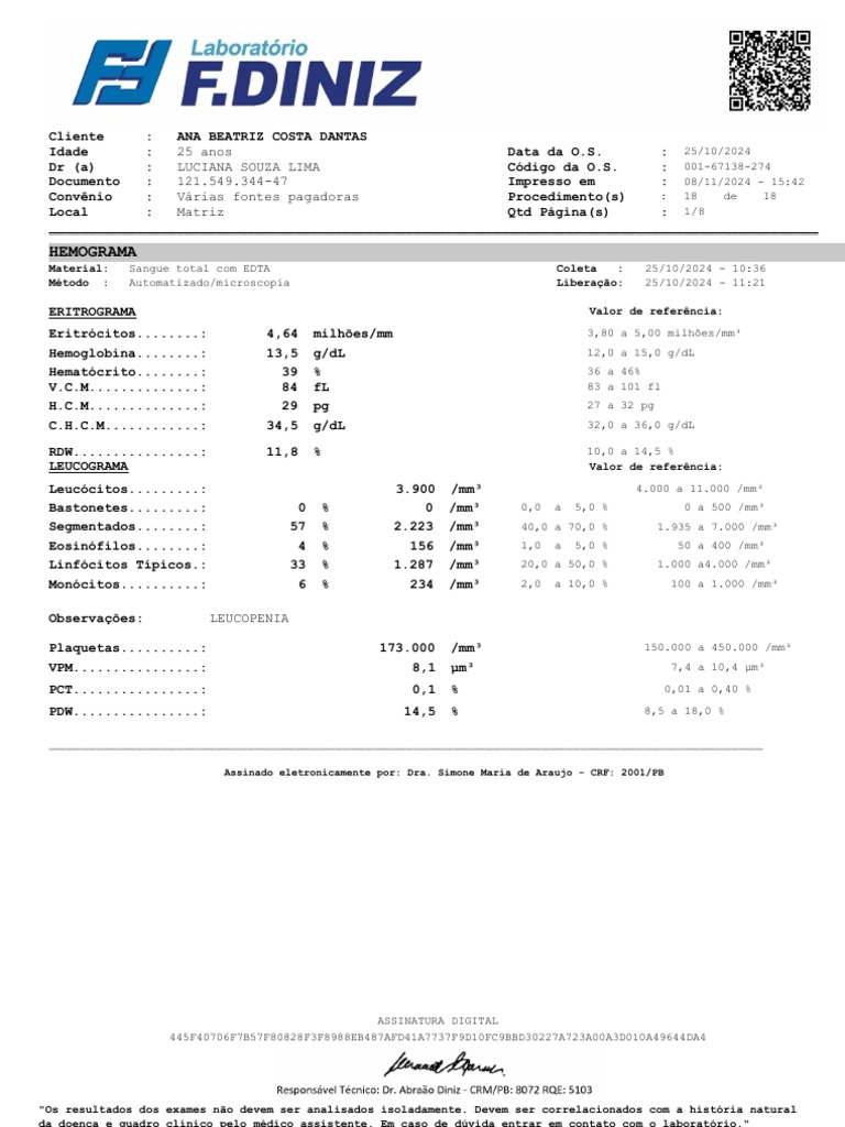 Material: Sangue total com EDTA Coleta : 25/10/2024 - 10:36