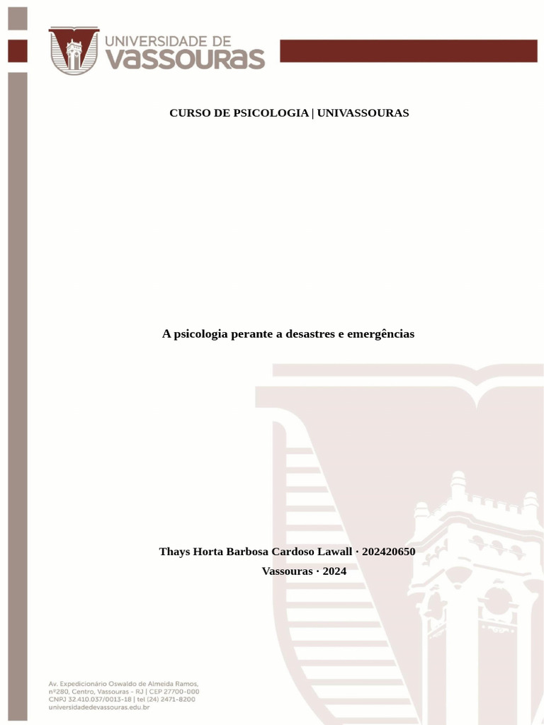 Univaversidade de Vassouras - Campus Vassouras, para alunos do curso de psicologia e