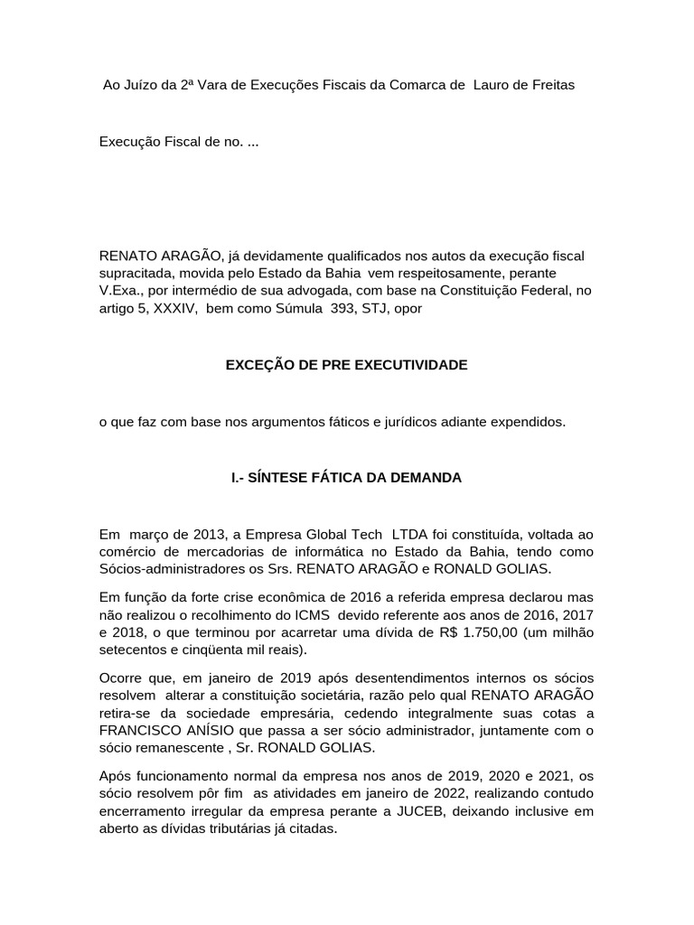 de Fazenda Pública da Comarca de Lauro de Freitas, em 01/02/2024 cobrando