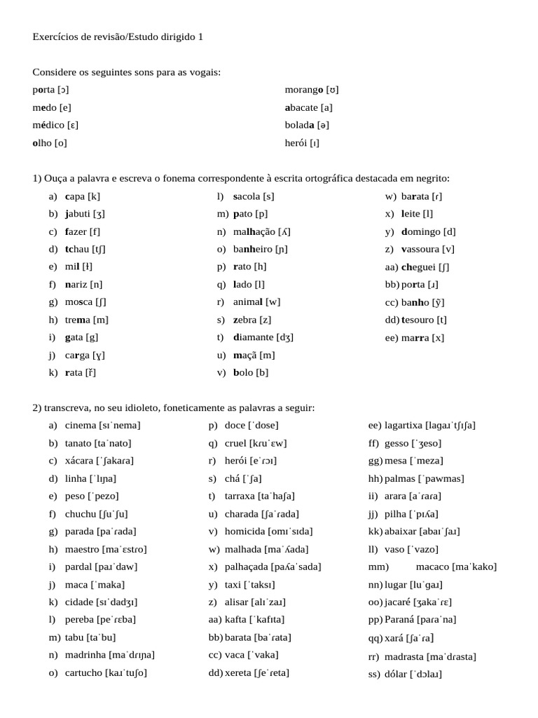 2) transcreva, no seu idioleto, foneticamente as palavras a seguir: