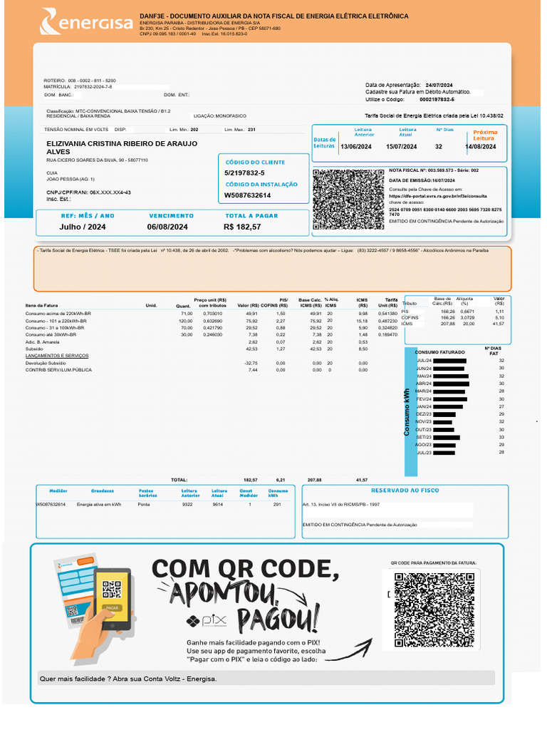 Leitura Anterior: 13/06/2024 Leitura Atual: 15/07/2024 Dias: 32