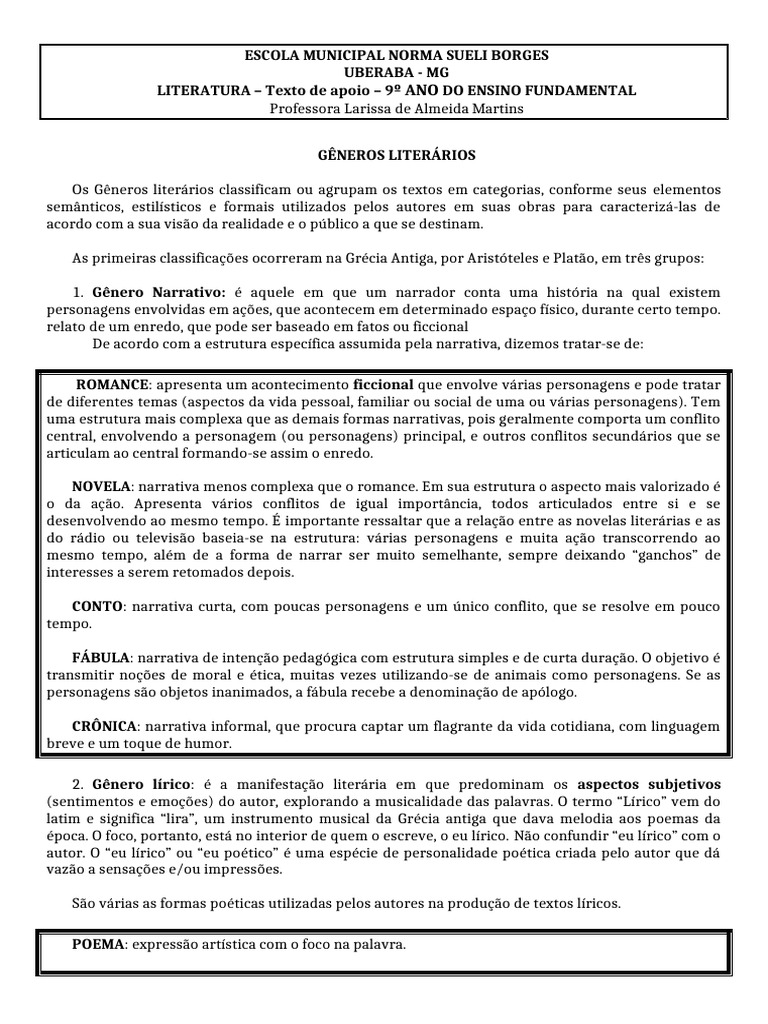 LITERATURA – Texto de apoio – 9º ANO DO ENSINO FUNDAMENTAL