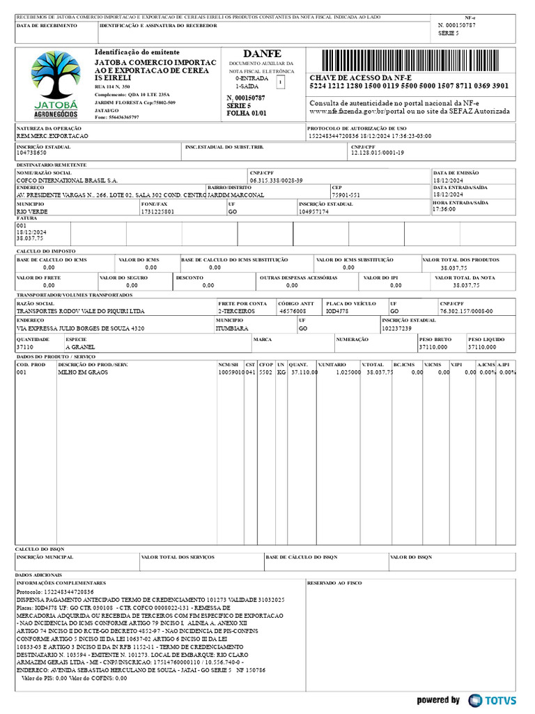 RECEBEMOS DE JATOBA COMERCIO IMPORTACAO E EXPORTACAO DE CEREAIS EIRELI OS PRODUTOS CONSTANTES DA NOTA FISCAL INDICADA AO LADO NF-e