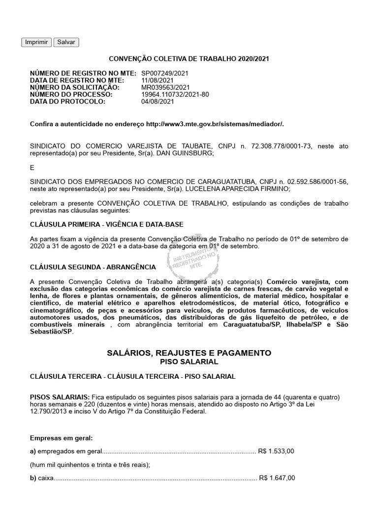 31/08/2021, devendo ser renovada a cada nova Convenção Coletiva. Os PISOS SALARIAIS com valores