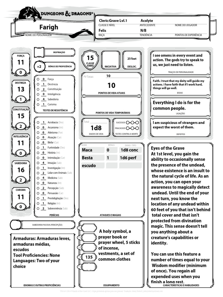 NOME DO PERSONAGEM RAÇA TENDÊNCIA PONTOS DE EXPERIÊNCIA