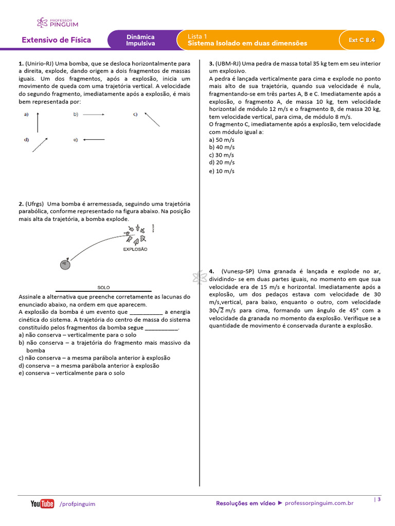 1. (Unirio-RJ) Uma bomba, que se desloca horizontalmente para 3. (UBM-RJ) Uma pedra de massa total 35 kg tem em seu interior
