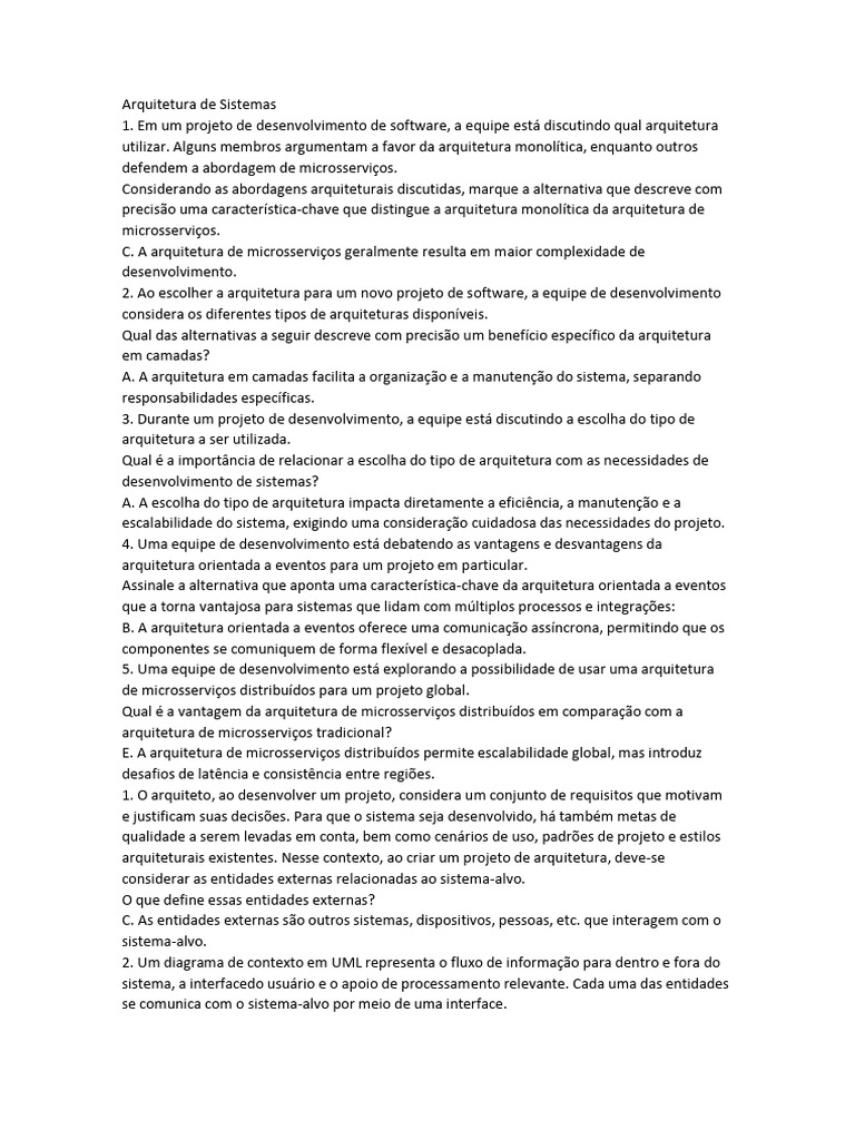 1. Em um projeto de desenvolvimento de software, a equipe está discutindo qual arquitetura