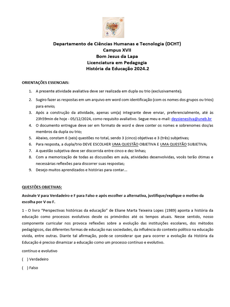 23h59min de hoje - 05/12/2024, como requisito avaliativo. Segue meu e-mail: deysienesilva@[Link]
