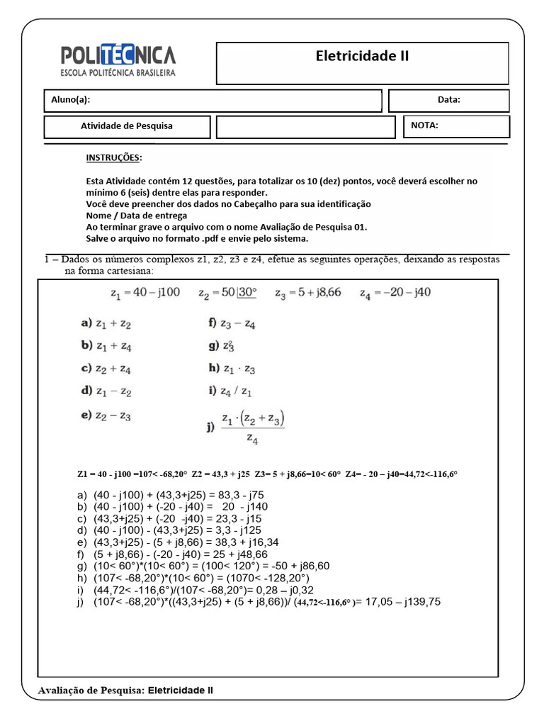 1 – Dados os números complexos z1, z2, z3 e z4, efetue as seguintes operações, deixando as respostas