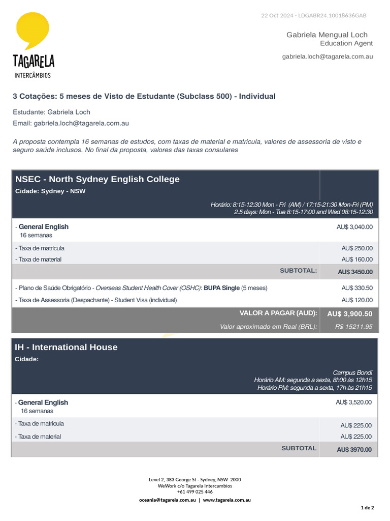 A proposta contempla 16 semanas de estudos, com taxas de material e matricula, valores de assessoria de visto e