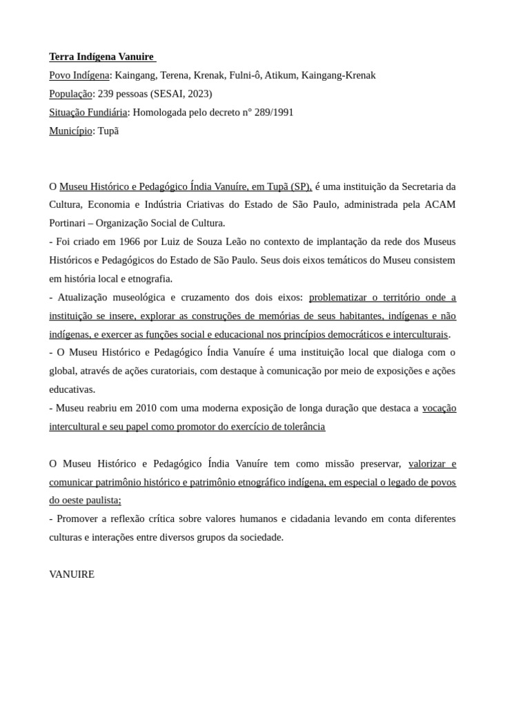 - Vanuíre foi uma Kaingang trazida de Campos Novos do Paranapanema (atual Campos Novos