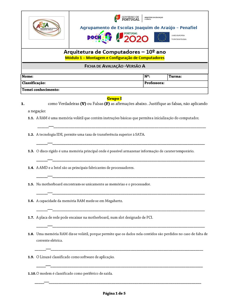 FICHA DE AVALIAÇÃO -VERSÃO A