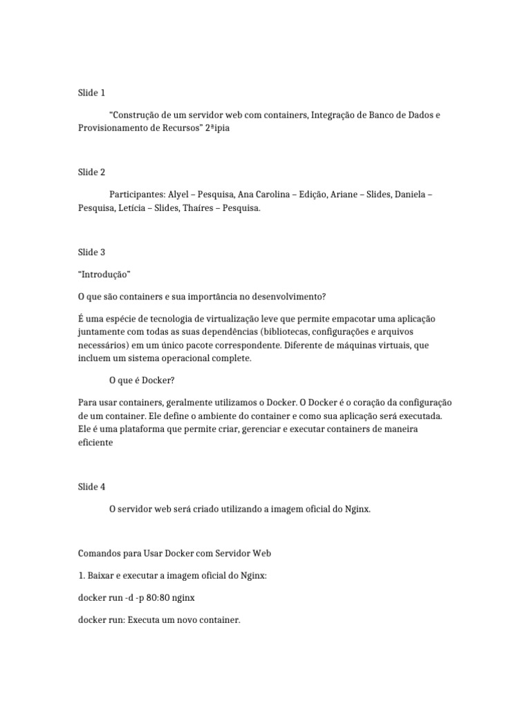 containers, incluindo a integração de um banco de dados e o provisionamento de recursos.