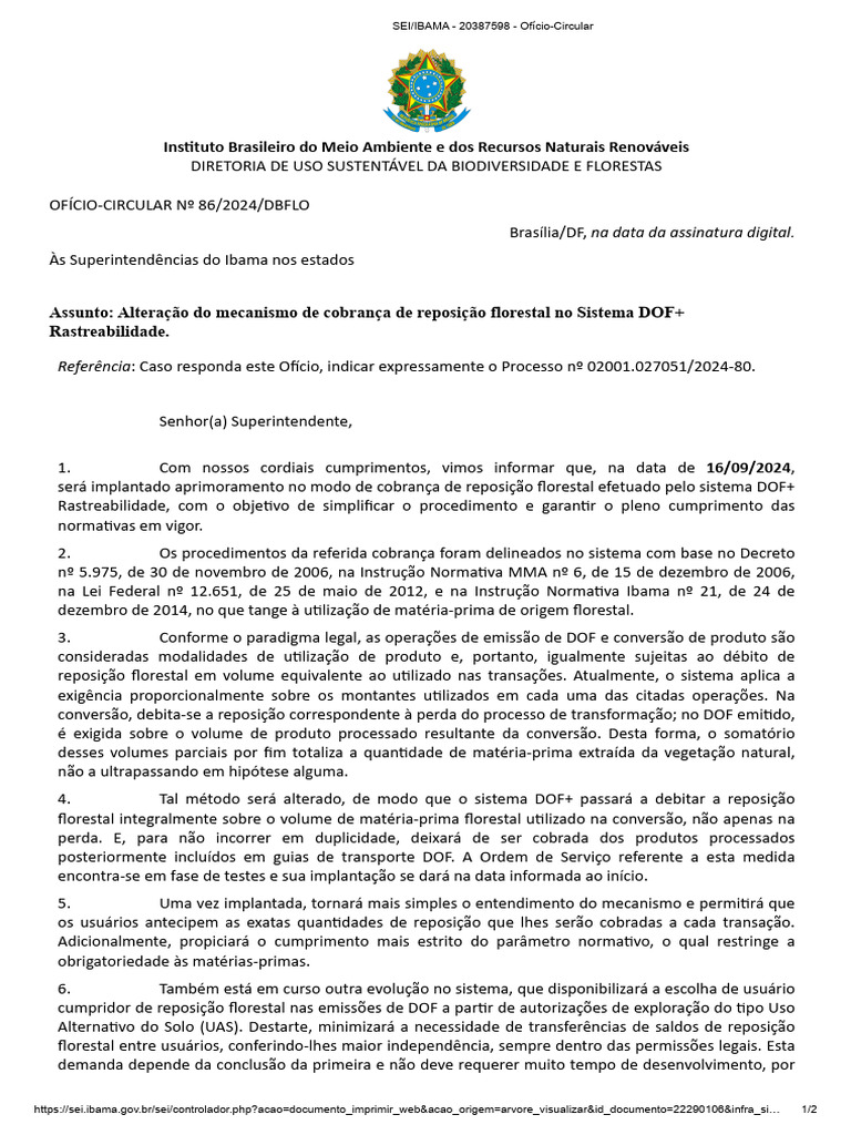 Assunto: Alteração do mecanismo de cobrança de reposição florestal no Sistema DOF+