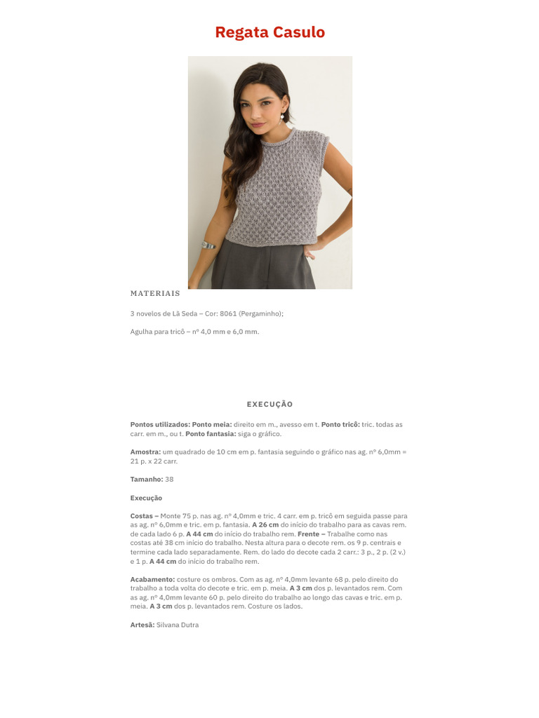 termine cada lado separadamente. Rem. do lado do decote cada 2 carr.: 3 p., 2 p. (2 v.)