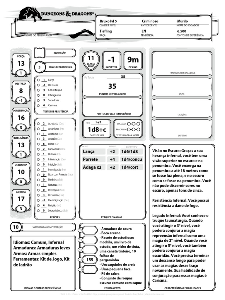 NOME DO PERSONAGEM RAÇA TENDÊNCIA PONTOS DE EXPERIÊNCIA
