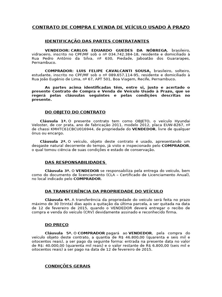 presente Contrato de Compra e Venda de Veículo Usado à Prazo, que se
