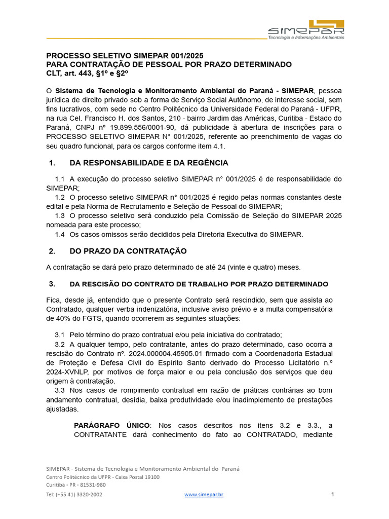 1.2 O processo seletivo SIMEPAR n° 001/2025 é regido pelas normas constantes deste