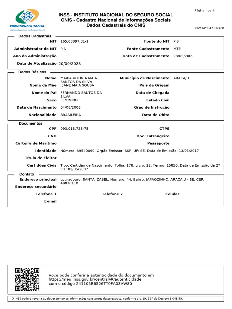 Nome MARIA VITORIA MAIA Município de Nascimento ARACAJU