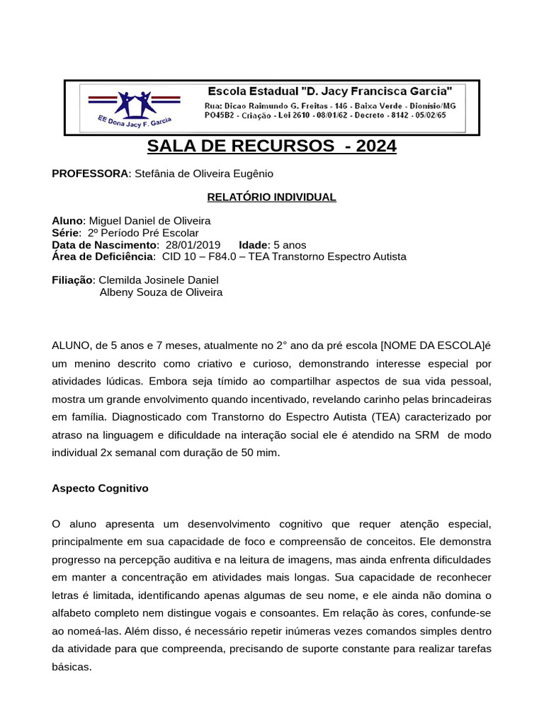 aspecto. Durante as atividades pedagógicas, ele demonstra hesitação em momentos de