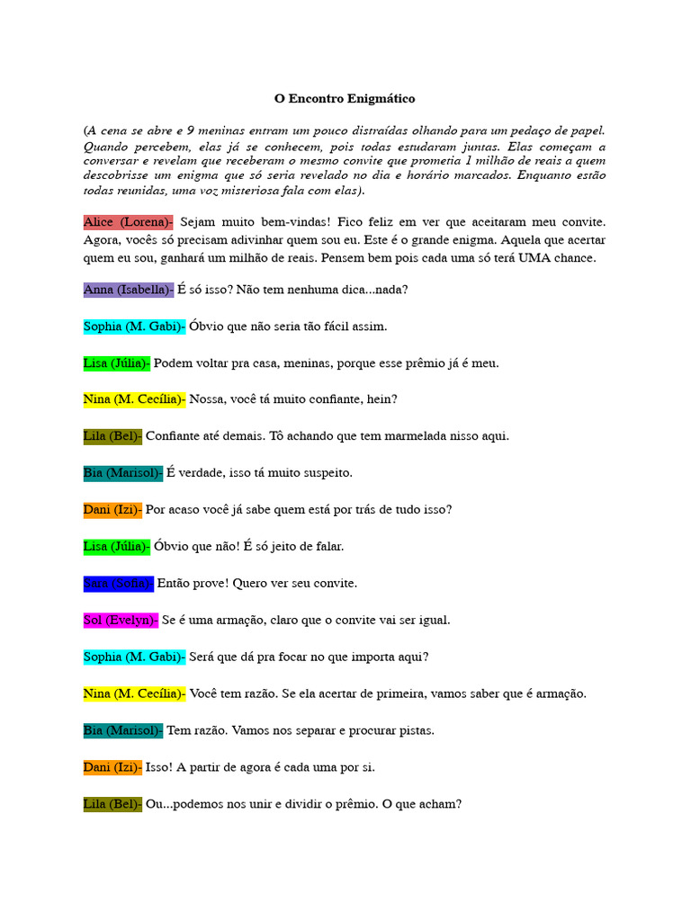 Agora, vocês só precisam adivinhar quem sou eu. Este é o grande enigma. Aquela que acertar