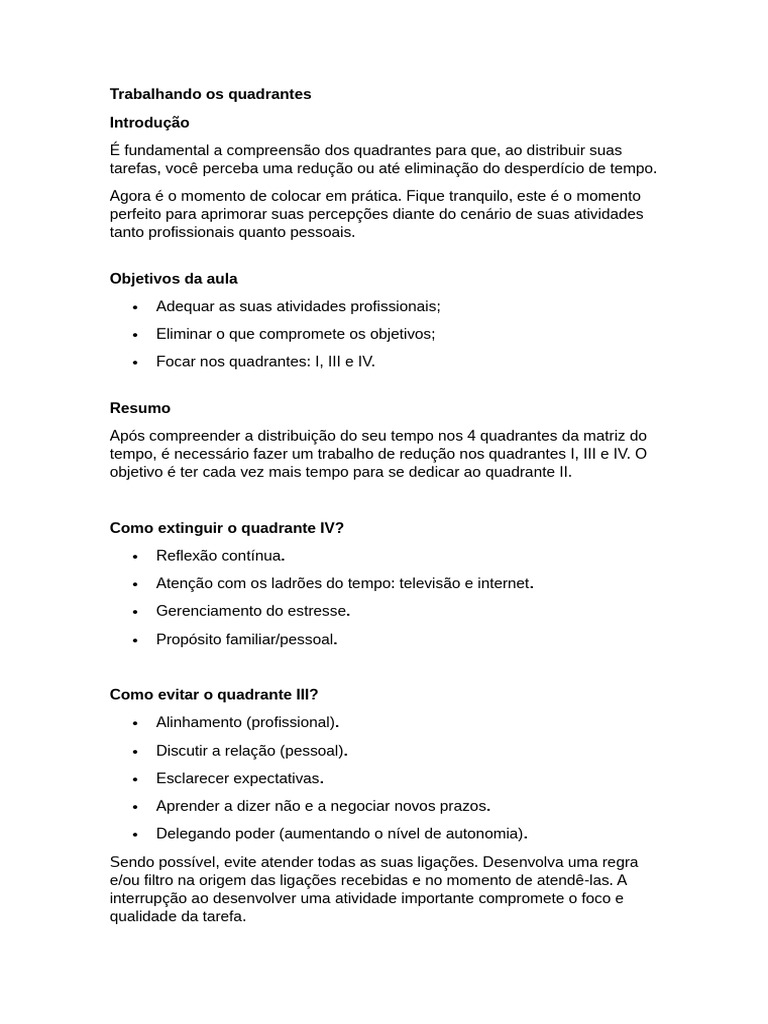 objetivo é ter cada vez mais tempo para se dedicar ao quadrante II.