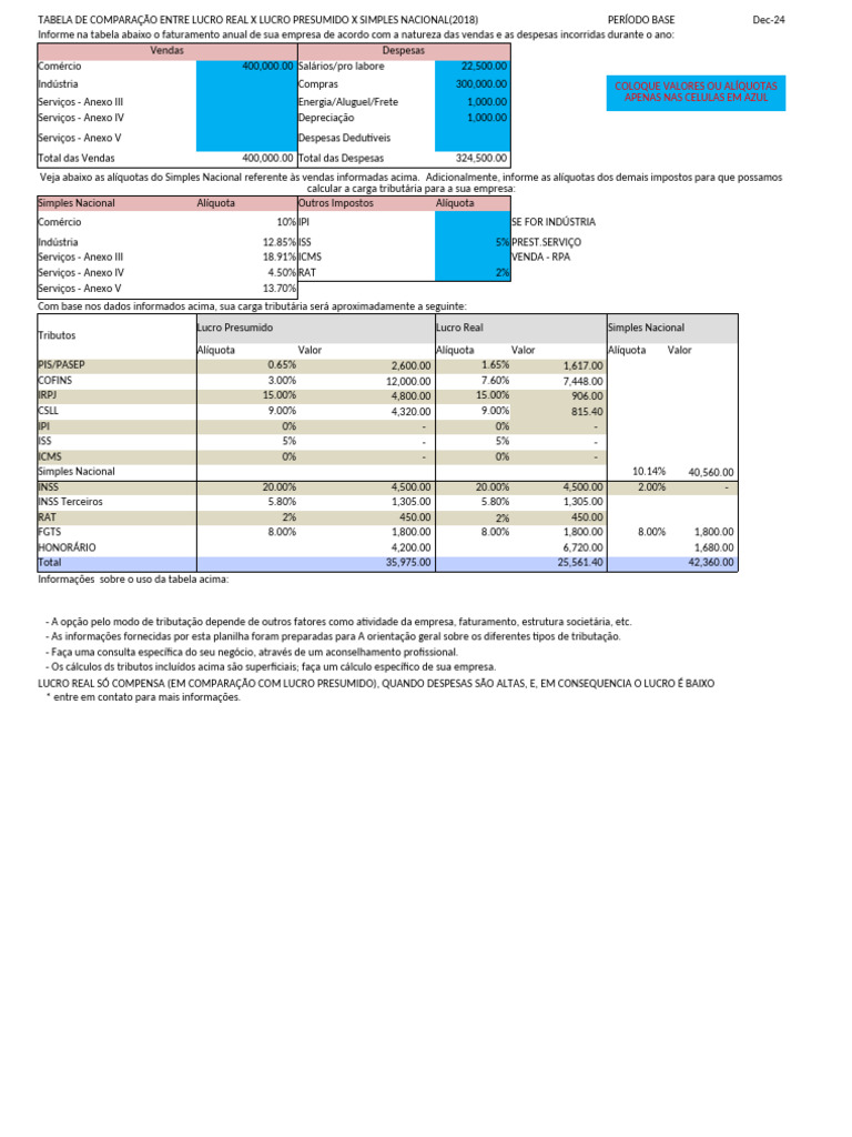 TABELA DE COMPARAÇÃO ENTRE LUCRO REAL X LUCRO PRESUMIDO X SIMPLES NACIONAL(2018) PERÍODO BASE Dec-24