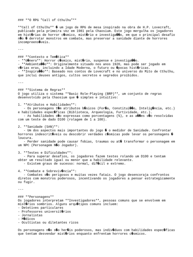 - **Inspira��o**: Baseado nos contos de Lovecraft e no universo do Mito de Cthulhu,