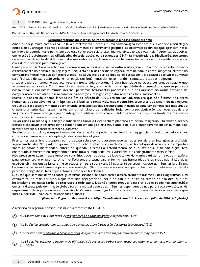 1 Q3069897 Português > Sintaxe , Regência