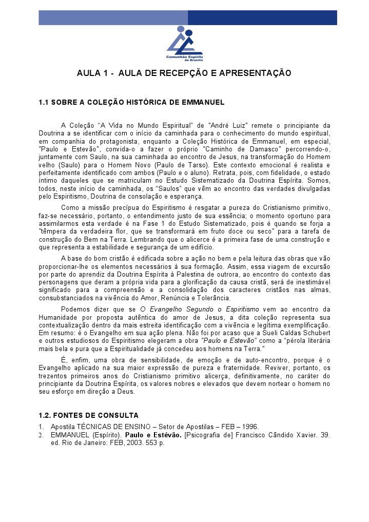 1. Apostila TÉCNICAS DE ENSINO – Setor de Apostilas – FEB – 1996. 2. EMMANUEL (Espírito). Paulo e Estêvão. [Psicografia de] Francisco Cândido Xavier. 39. ed. Rio de Janeiro: FEB, 2003. 553 p.