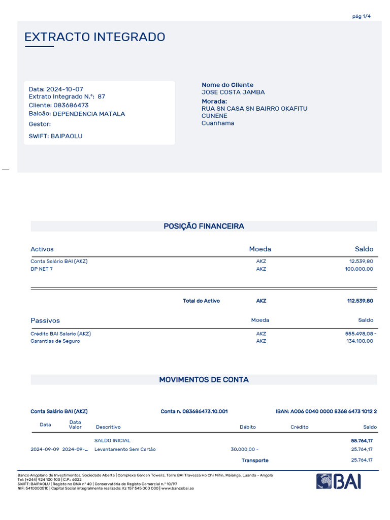Crédito BAI Salario (AKZ) Conta n. 083686473.71.002