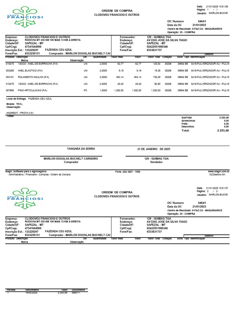 Empresa: CLODOVEU FRANCIOSI E OUTROS Fornecedor: 129 - GUIMAG TGA