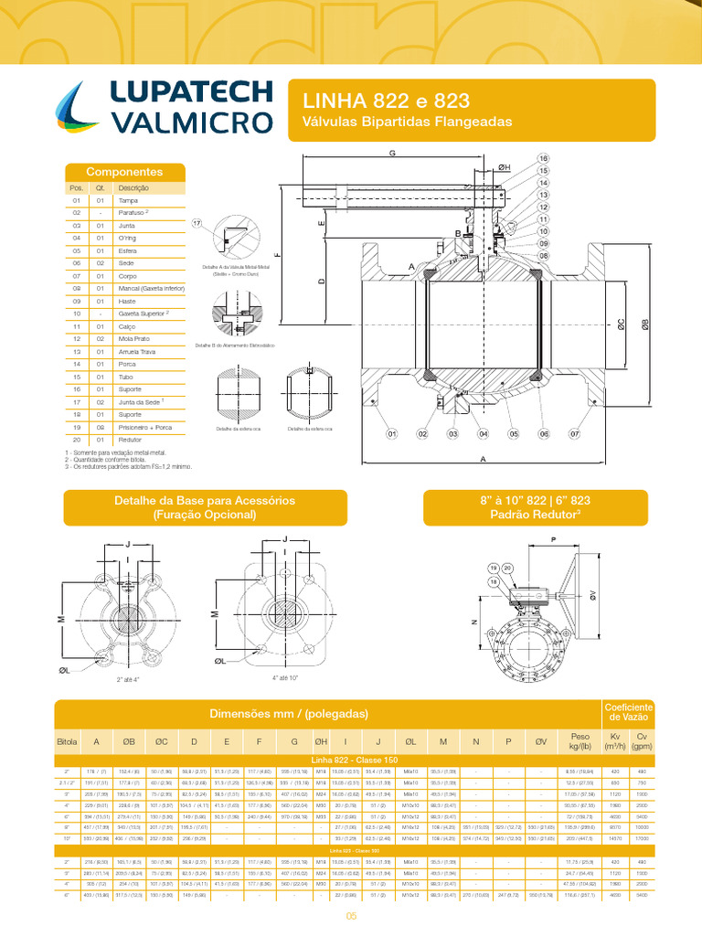 822 Válvulas de Esfera Bipartidas Flangeadas, Classe150 2 - WCB 2 - CA15 / 410 2 - PP aço carbono 0 - PTFE 8 - Flanges ANSI 05 - 1/2" 1 - Alavanca