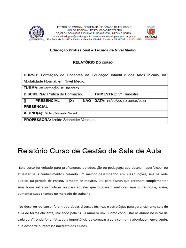 Relatório Curso de Gestão de Sala de Aula