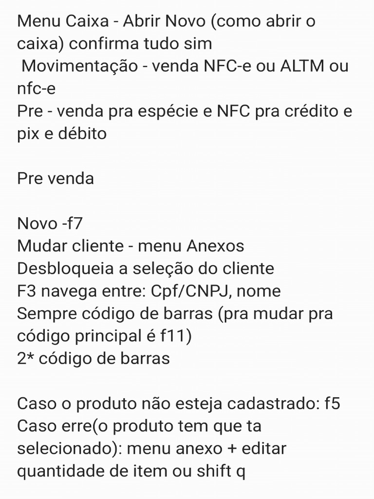 O documento fornece instruções detalhadas sobre como operar um sistema de caixa, incluindo abertura de caixa, movimentação de vendas, pré-vendas, cancelamento de cupons e fechamento de caixa. Ele inclui atalhos de teclado para facilitar o processo, como F7 para nova venda e F8 para fechamento. Também aborda procedimentos para sangria, suprimento e transferências de dinheiro.