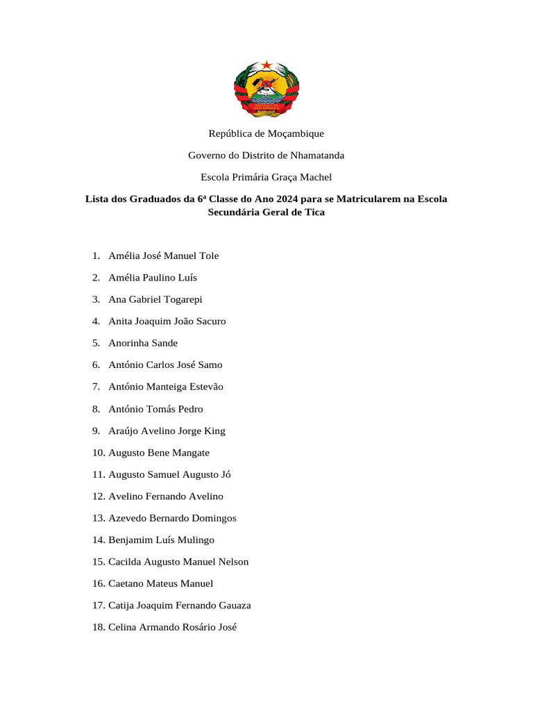 Lista dos Graduados da 6ª Classe do Ano 2024 para se Matricularem na Escola