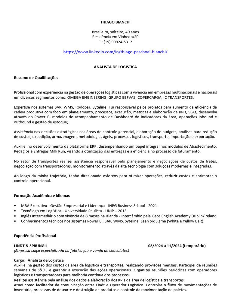 Profissional com experiência na gestão de operações logísticas com a vivência em empresas multinacionais e nacionais