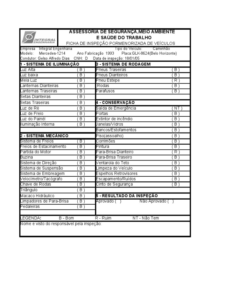 Empresa Integral Engenharia Tipo do Veculo: Caminho Modelo: Mercedes-1214 Ano Fabricao 1993 Placa:GLK-8624(Belo Horizonte) Condutor: Gelso Alfredo Dias CNH: D Data de inspeo: 18/01/05