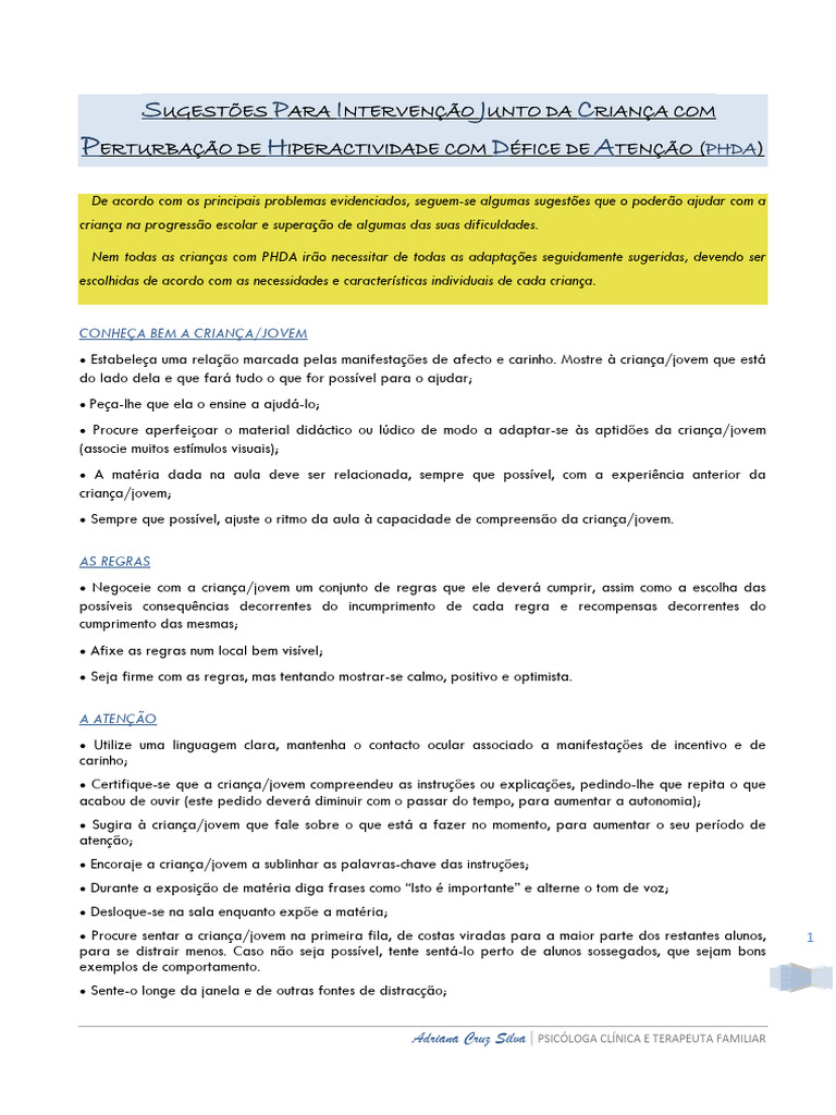 Nem todas as crianças com PHDA irão necessitar de todas as adaptações seguidamente sugeridas, devendo ser