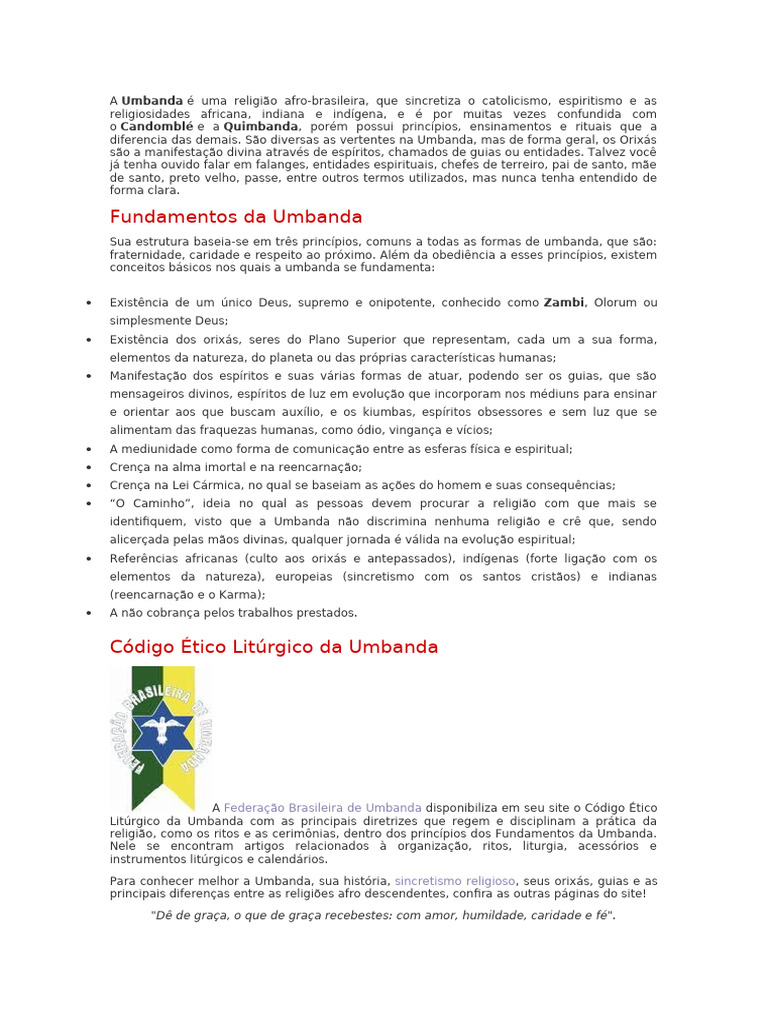 A Federação Brasileira de Umbanda disponibiliza em seu site o Código Ético