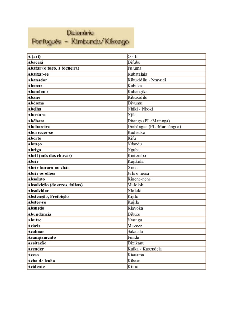 Pex Dibuba Kabiribiri Kialu Kubala Nkonko Nkenda Muenge Ulungu Muimbu Imbua Sambil (tambm Sambil) Kimbamba Xitu Mbudi Kusoma Soma Mukanda Mabulukutu Inzo Nzo (Kikongo) Kibatubatu Kukanda Valanganza Nduku Nzak Kusamba Lunda (Kikongo) Mbalal (Kikongo) Mbalal Axax Bot Ualua Kinda Sanz Kitoto Kuixana Muxinga Mbinga Hai (PL.:Jihai) Kudila Dibata