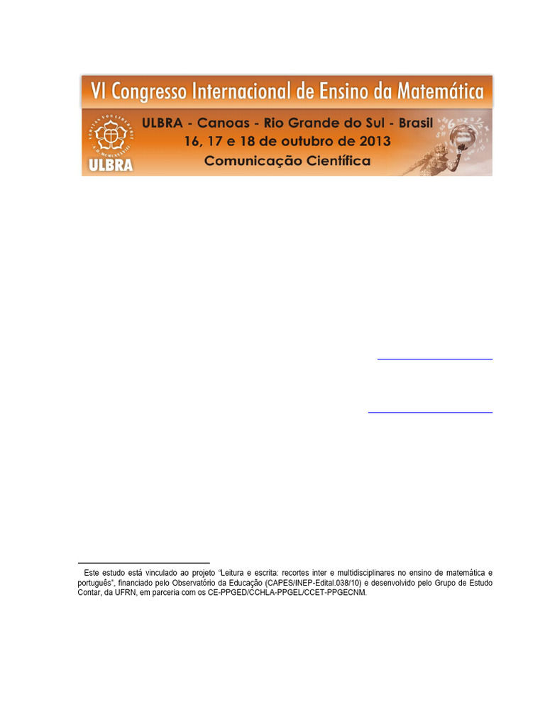 Este estudo está vinculado ao projeto “Leitura e escrita: recortes inter e multidisciplinares no ensino de matemática e