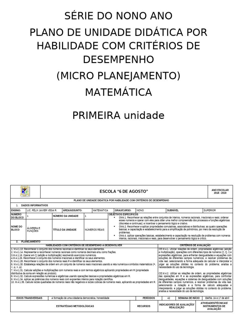 PLANO DE UNIDADE DIDÁTICA POR HABILIDADE COM CRITÉRIOS DE DESEMPENHO
