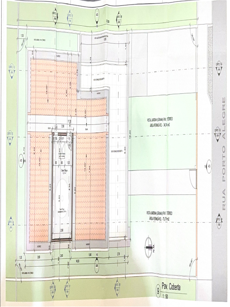 O documento menciona áreas permeáveis em um projeto, com medidas específicas de 34,74 m² e 75,79 m². As áreas estão localizadas no térreo e referem-se a um espaço denominado 'VISTA JARDIM'. Também é citada a Rua Porto Alegre.