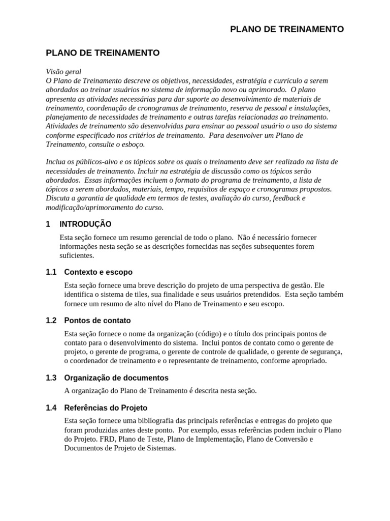 fornece um resumo de alto nível do Plano de Treinamento e seu escopo.