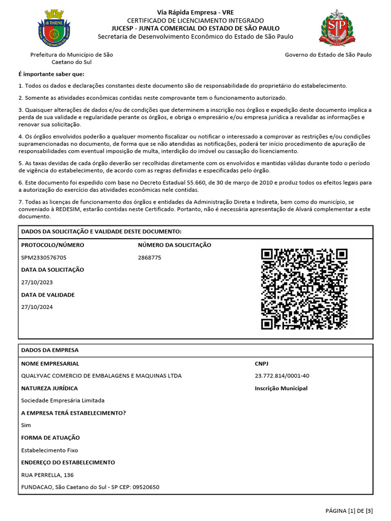1. Todos os dados e declarações constantes deste documento são de responsabilidade do proprietário do estabelecimento.