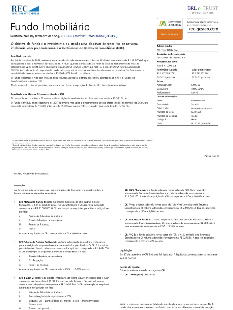 Atualmente a REC atua como Consultor de Investimento no FII REC Recebíveis Imobiliários